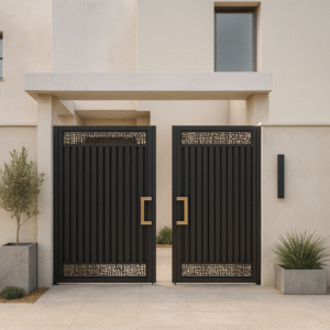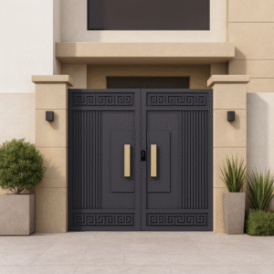 Su composición amplia y vertical combina solidez, proporción y una calidez sutil que enmarca la entrada con carácter. El metal dialoga con la luz natural para crear un acceso imponente, elegante y atemporal.